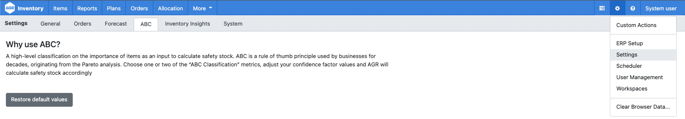 To set up your ABC classifications: click on the: gearwheel > Settings > ABC.