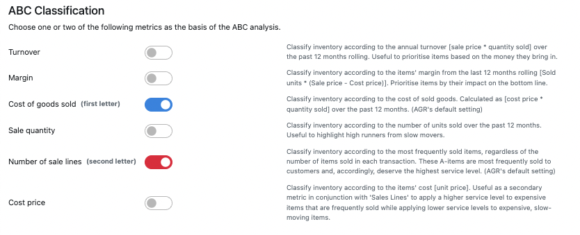 AGR enables you to simplify the management of inventories consisting of large numbers of distinct items. By classifying first on ABC key metrics and from there, link the desired service level through the confidence factor. Hereby, giving your SKU‘s that deliver the biggest impact to your bottom line and most frequently bought by customers a higher service level than the least important SKU‘s.