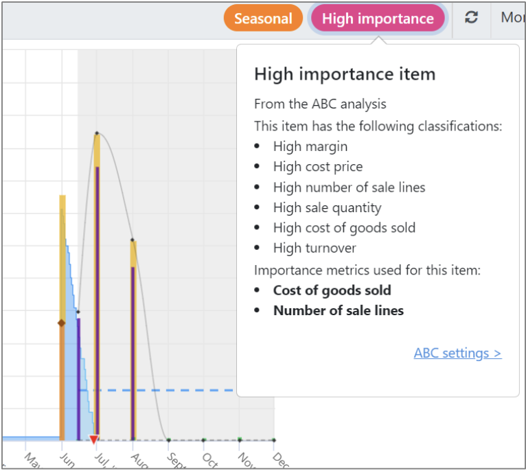In the item card the importance ranking is visible as a label, and if clicked the user will see item specific ranking from all ABC parameters as well as the ABC importance metrics used.